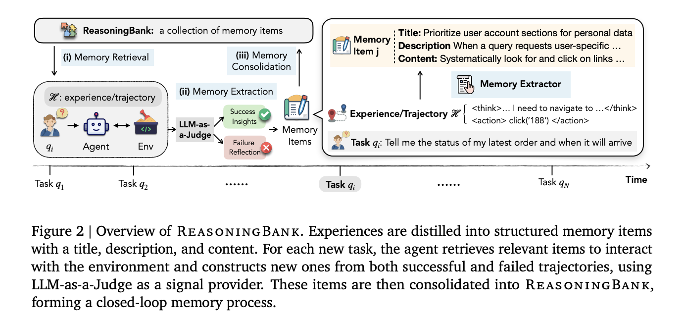 Memory items are structured, not raw: ReasoningBank doesn’t store messy action logs. It compresses experience into clean three-part memory items (title, description, content) that are human-interpretable and directly injectable into an agent’s system prompt via embedding-based similarity search.