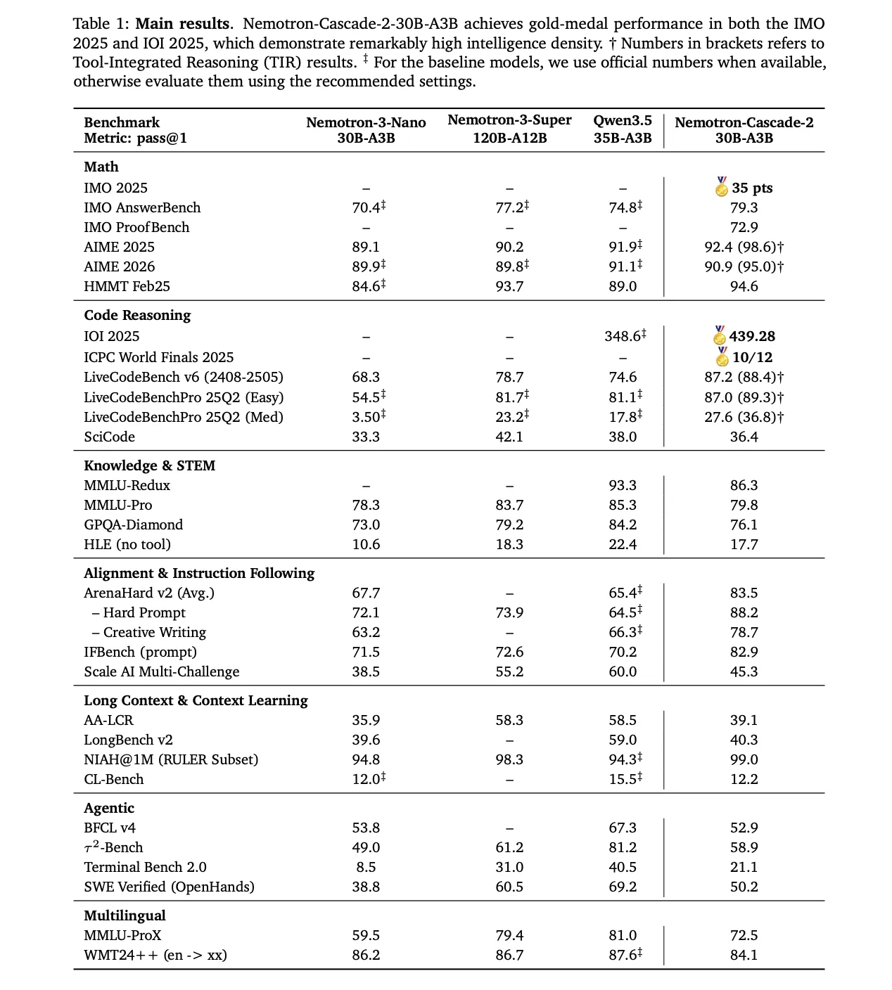 NVIDIA has announced the release of Nemotron-Cascade 2, an open-weight 30B Mixture-of-Experts (MoE) model with 3B activated parameters. The model focuses on maximizing ‘intelligence density,’ delivering advanced reasoning capabilities at a fraction of the parameter scale used by frontier models. Nemotron-Cascade 2 is the second open-weight LLM to achieve Gold Medal-level performance in the 2025 International Mathematical Olympiad (IMO), the International Olympiad in Informatics (IOI), and the ICPC World Finals.