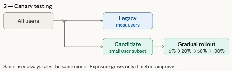 By exposing both models to real-world traffic, teams can compare downstream performance metrics such as click-through rate, conversions, engagement, or revenue. This controlled experiment allows organizations to evaluate whether the candidate model genuinely improves outcomes before gradually increasing its traffic share or fully replacing the legacy model.