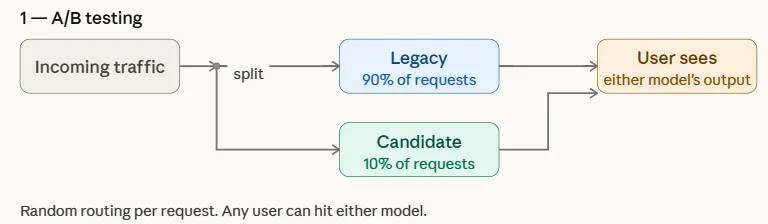 A/B testing is one of the most widely used strategies for safely introducing a new machine learning model in production. In this approach, incoming traffic is split between two versions of a system: the existing legacy model (control) and the candidate model (variation). The distribution is typically non-uniform to limit risk—for example, 90% of requests may continue to be served by the legacy model, while only 10% are routed to the candidate model.