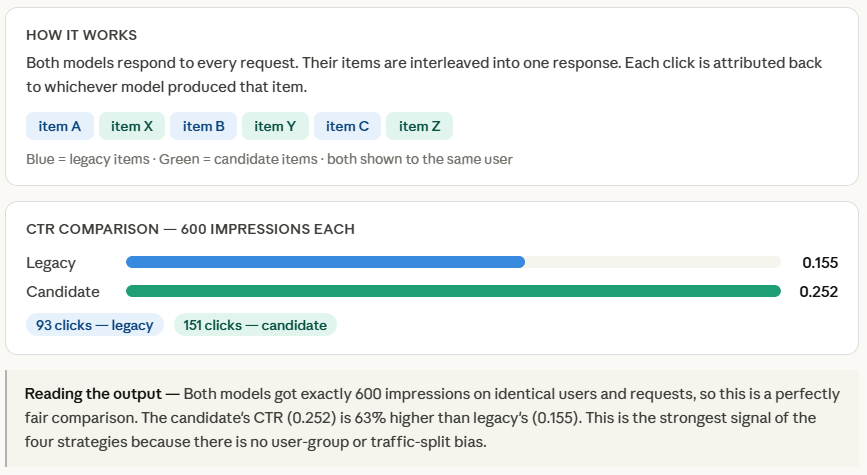 At the end, we compute CTR separately for each model’s items. Because both models competed on the same requests against the same users at the same time, there is no confounding factor — any difference in CTR is purely down to model quality. This is what makes interleaved testing the most statistically clean comparison of the four strategies.