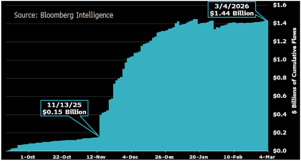 According to Bloomberg Intelligence analyst James Seyffart, XRP ETF demand is still strong compared to the broader crypto market, which has been facing downward pressure since the beginning of the year. Notably, Bloomberg Intelligence data shows cumulative inflows into Spot XRP ETFs rising from roughly $150 million in mid-November 2025 to about $1.44 billion by March 4, 2026.